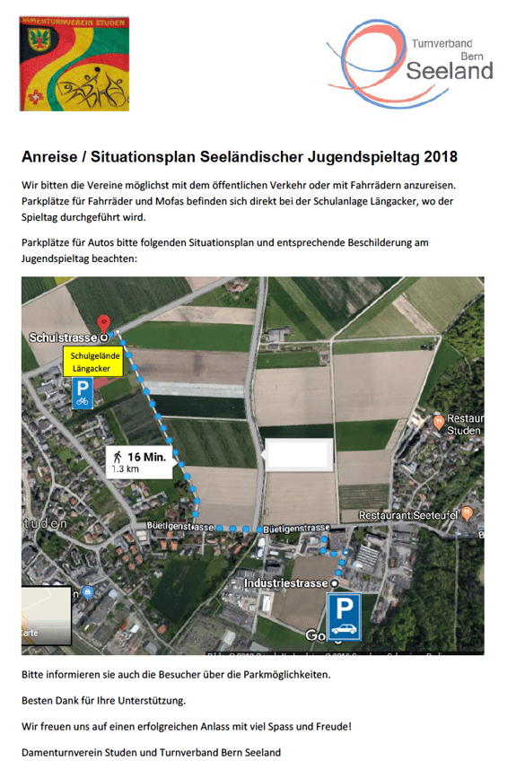 Wir bitten Sie, mit den öffentlichen Verkehrsmitteln anzureisen und die Beschilderungen in Studen zu beachten. Autoparkplätze werden bei der Cotra Studen zur Verfügung stehen (10 -15 Min. zu Fuss bis zum Sportplatz), Velos und Mofas können direkt beim Oberstufenzentrum parkiert werden. => Siehe Situationsplan