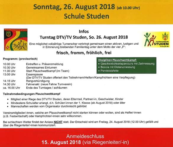 Das OK des DTV Studen freut sich auf zahlreiche Besucherinnen und Besucher, freut sich auf einen erfolgreichen Tag und wünscht den teilnehmenden Kindern und Jugendlichen viel Spass und Freude beim Spiel.