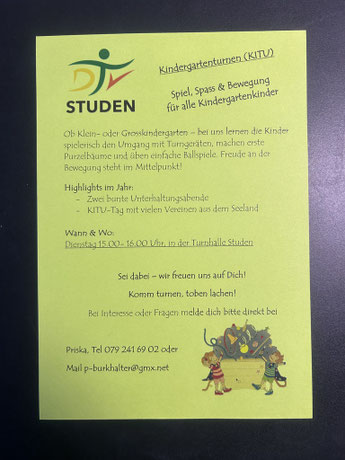 Das KITU ist für die Kindergartenkinder (Klein- und Grosskindergarten). Ziel ist es, den Kindern die diversen Turngeräte näher zu bringen, ihnen Grundelemente wie z.B. den "Purzelbaum" oder aber auch einfache Ballführung bei zu bringen.